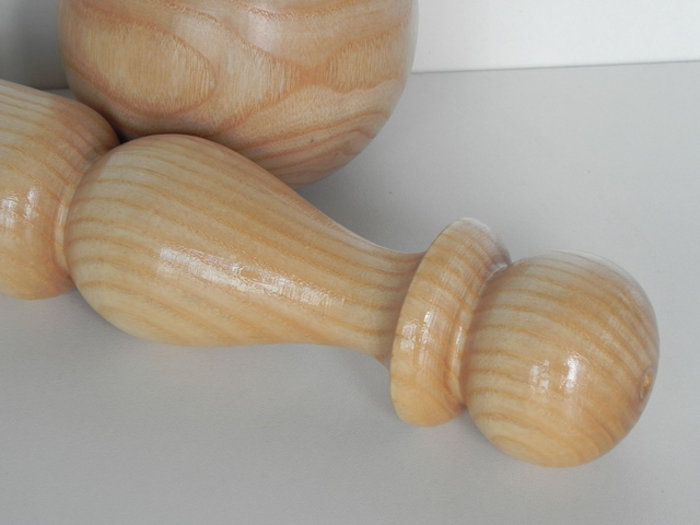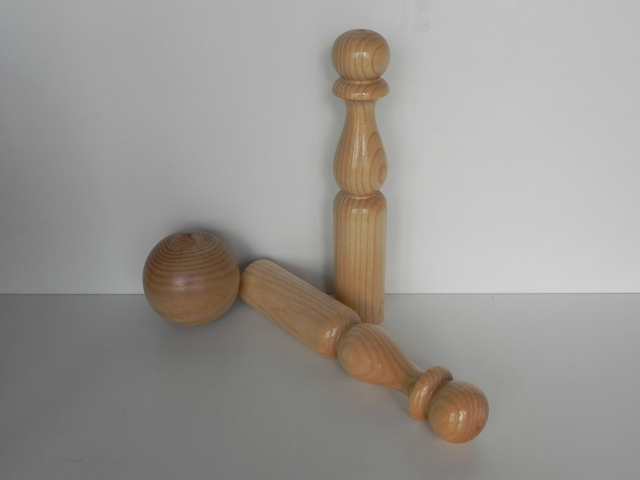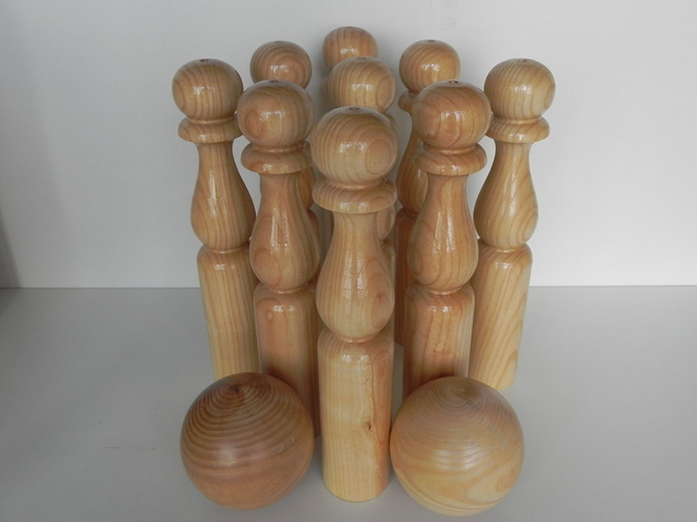 Jeux de 9 quilles de 300 mm de hauteur et d'un diamètre de 55 mm avec 2 boules de 100 mm de diamètre, le tous vernis et ranger dans sa caisse de transport.